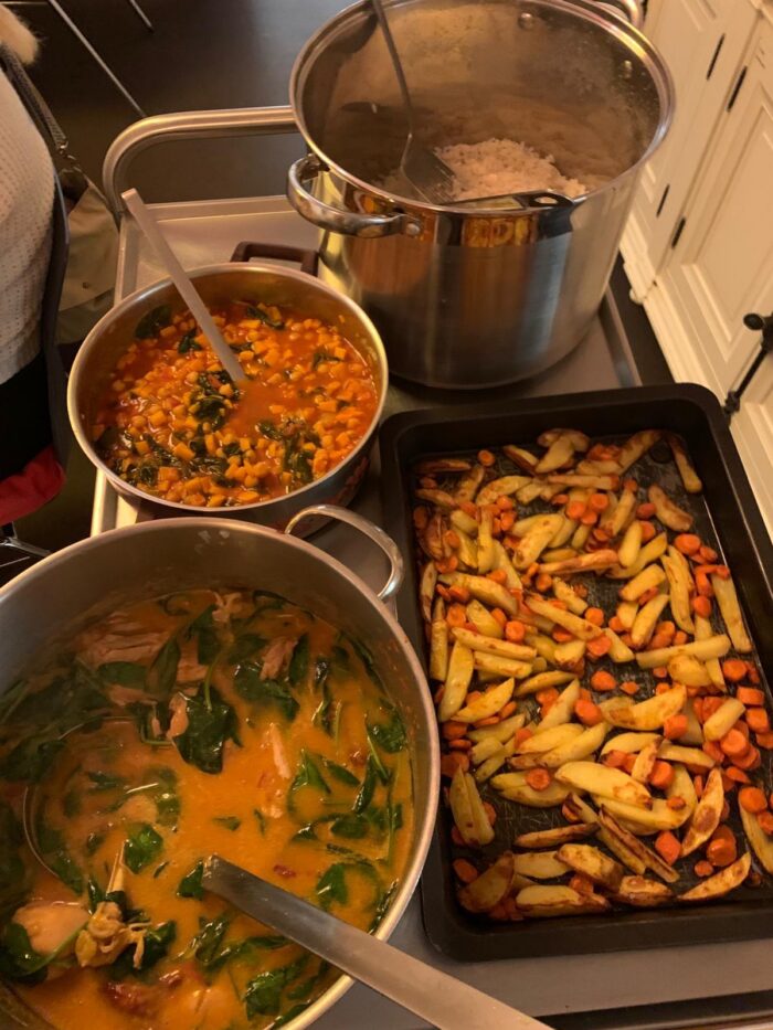 Organisiert werden die Abende von Rosi, die die Kochgruppe von Anfang an begleitet. Sie sucht im Vorfeld Rezepte aus und kümmert sich um den Einkauf. Vor Ort entscheiden die Teilnehmenden dann gemeinsam, was sie kochen möchten. Schnell finden sich kleine Gruppen zusammen und beginnen mit den Vorbereitungen. Dabei ist immer auch ein vegetarisches Gericht dabei, das gemeinsam gekocht wird.
