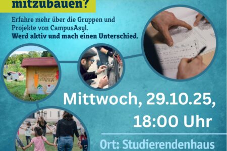 An diesem Abend stellen wir unsere Projekte vor, beantworten Fragen und zeigen, wie ein Einstieg ins Ehrenamt bei CampusAsyl aussehen kann. Ob regelmäßig oder punktuell, ob mit konkreten Ideen oder einfach mit Interesse: Wer sich engagieren möchte, ist herzlich willkommen. Wir freuen uns auf neue Gesichter und darauf, gemeinsam neue Impulse zu setzen.