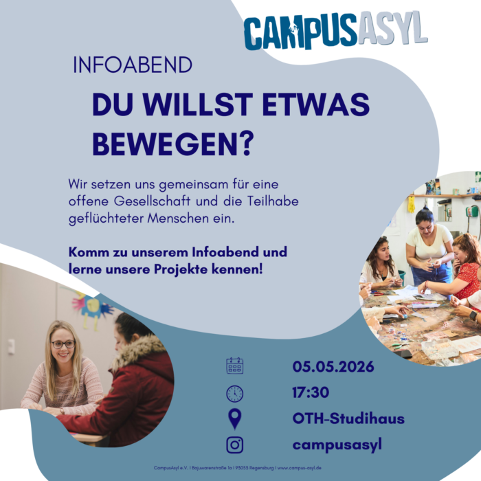 Dann laden wir dich herzlich zu unserem Infoabend ein. Lerne CampusAsyl und unsere vielfältigen Projekte kennen und erfahre, wie du dich einbringen kannst. Egal, ob du schon konkrete Ideen hast oder einfach neugierig bist, bei uns bist du willkommen. Der Infoabend bietet Raum für Austausch, Fragen und erste Einblicke in unsere Arbeit.