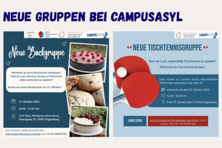 CampusAsyl freut sich über zwei neue Angebote, die Menschen zusammenbringen und für gemeinsame Freude sorgen! Jede*r ist herzlich willkommen und kann sich gerne per Mail unter julia.stegerer@campus-asyl.de oder per WhatsApp unter 0176 34403766 anmelden.