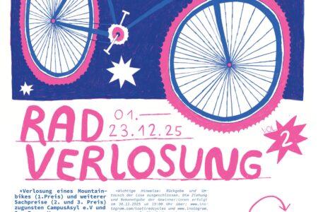 Auch 2025 heißt es wieder: Lose kaufen, Solidarität zeigen und mit etwas Glück ein ganz besonderes Fahrrad gewinnen! Zum zweiten Mal veranstalten wir gemeinsam mit Too Tired Cycles eine Radverlosung zugunsten der Arbeit von CampusAsyl und in diesem Jahr neu, auch zugunsten von Sea Eye. Die Resonanz ist auch dieses Jahr überwältigend.