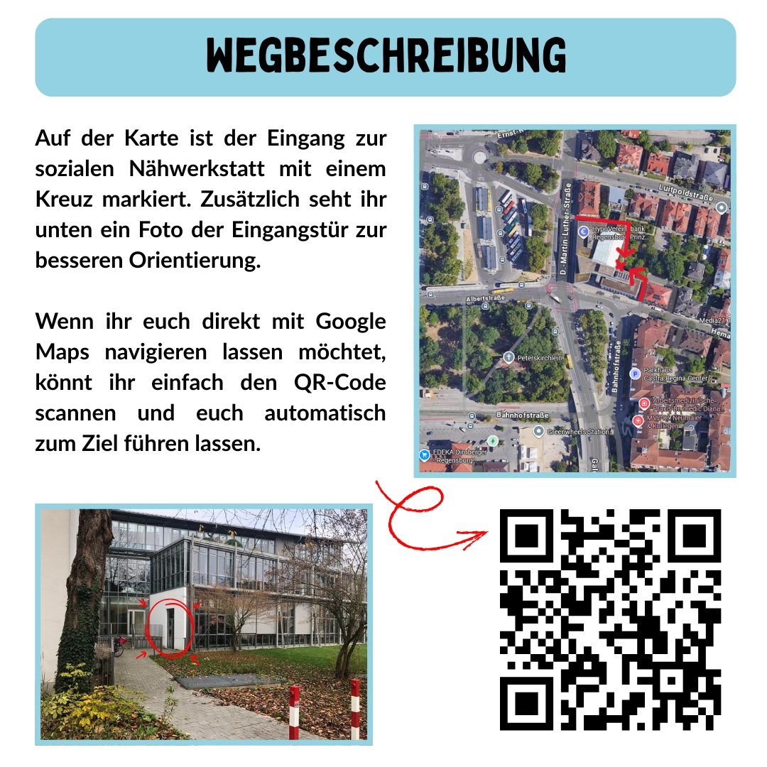 Die soziale Nähwerkstatt ist immer samstags (außer an Feiertagen) zwischen 09:30 und 12:30 Uhr geöffnet. Die Nähwerkstatt befindet sich in den „Räumen für Engagement am Bahnhof“ an der Straßenecke Hemauerstraße/D.-Martin-Luther-Straße. Eine Wegbeschreibung findest du hier.